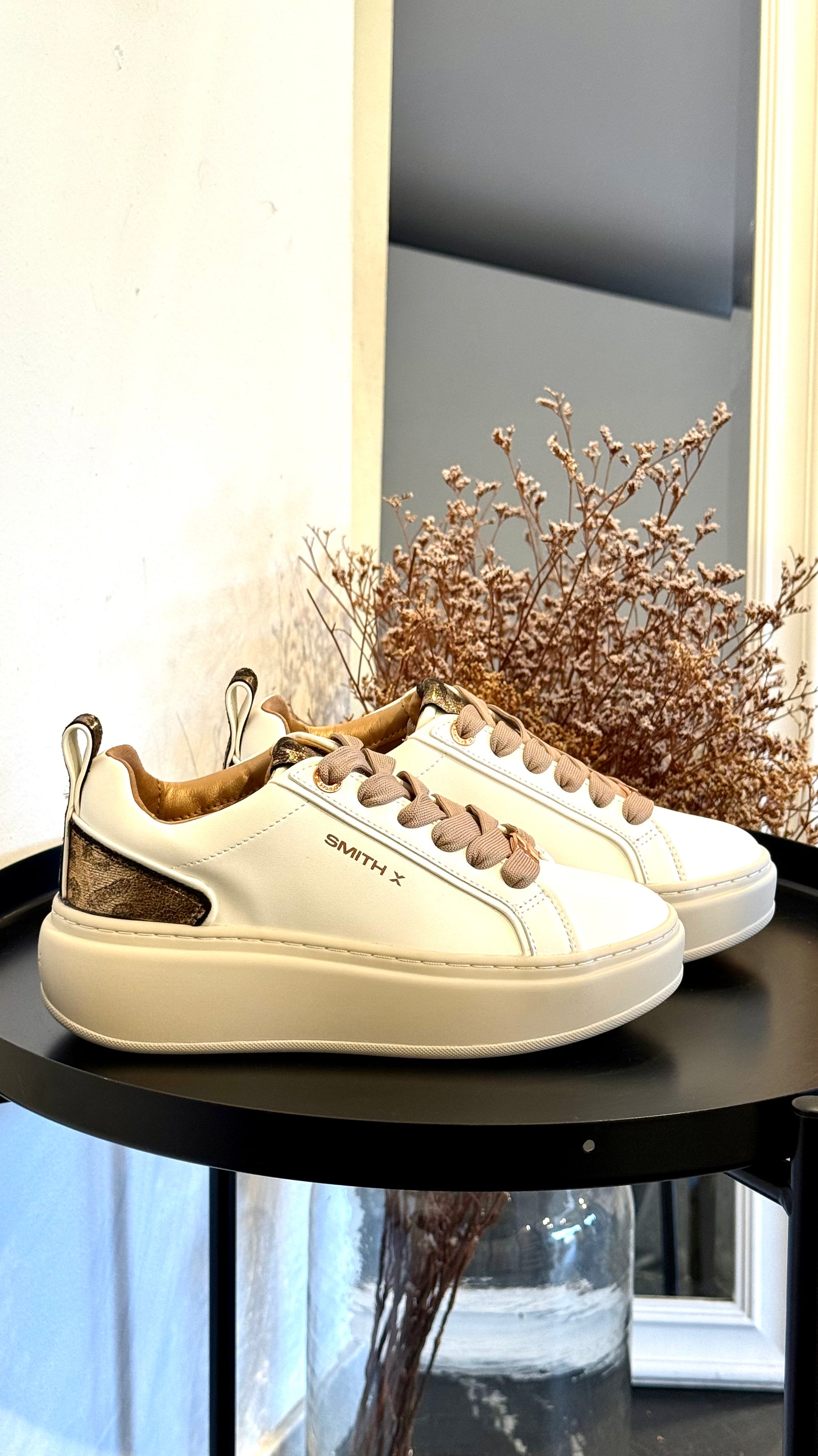 STONE è la sneaker minimal di Smith X che cattura l'essenza dello stile urbano contemporaneo. Questa edizione combina una suola avorio con lacci rosa antico che aggiungono un tocco di sofisticatezza inaspettata. I dettagli in laminato bronzo completano il design, creando un contrasto affascinante tra semplicità e ricercatezza.